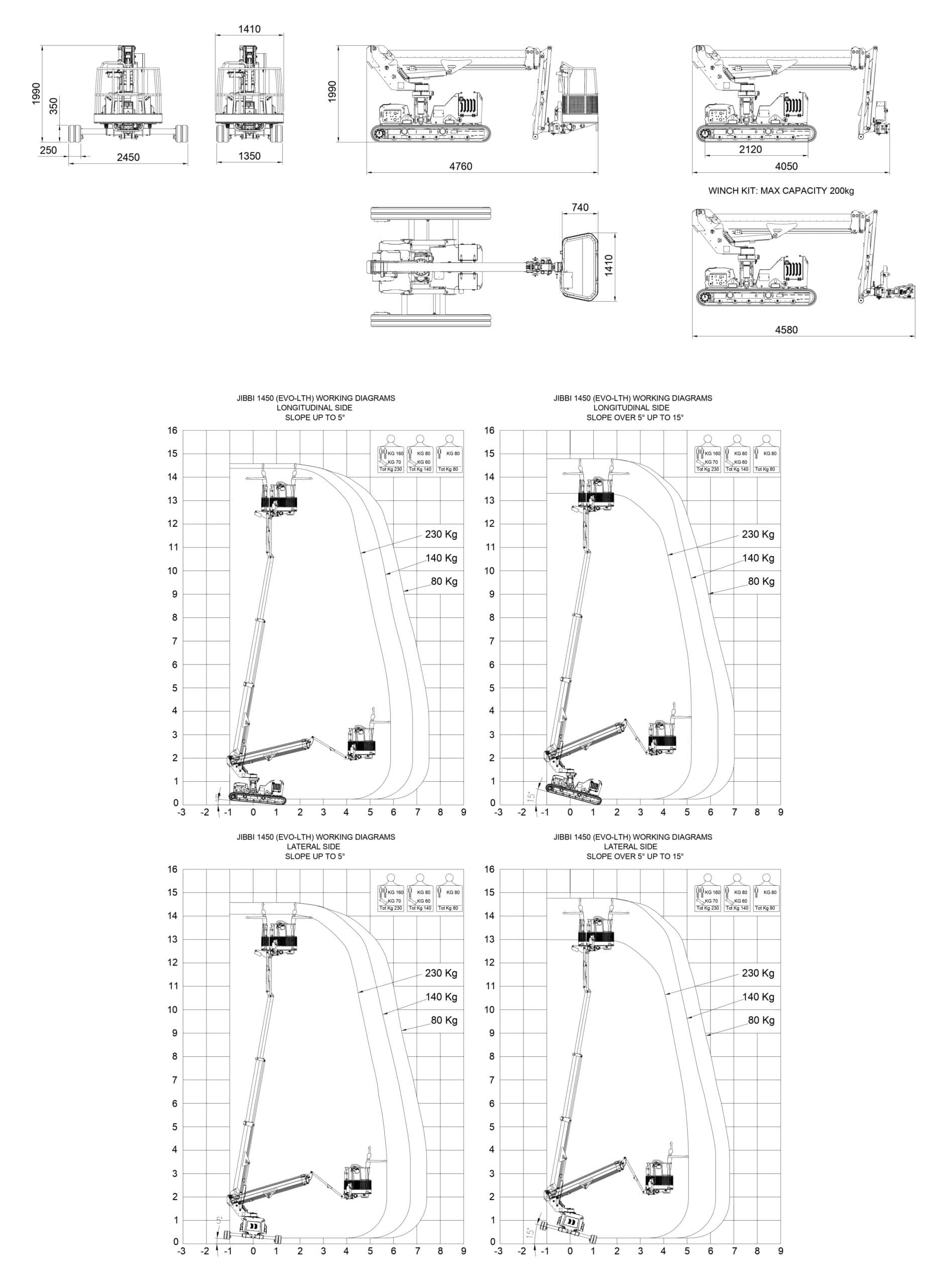 To meet market demands and facilitate the various activities performed by end users in a range of applications, Almac has equipped the JIBBI 1450 EVO with the most advanced technology, while maintaining the high performance characteristics typical of the company’s machinery. The self-propelled boom lift is distinguished by its 7.5 m front outreach (with 80kg load), 6.8 m outreach (with 140 kg load) and 5.8 m outreach (with 230 kg load). The variable track undercarriage offers different track widths, specifically 1.35 m, 1.90 m, 2.10 m and 2.45 m.